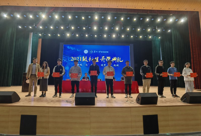 为了进一步激励大一新生尽早调整心态、状态,以更饱满地热情投入到大学的学习,在全球知名企业恩智浦公司的支持下,学院自2020年起设立“恩智浦新生奖学金”,学院副院长陈小平教授宣读了2020级“恩智浦新生奖学金”获奖名单,学院院长沈纲祥教授为2020级10名获奖同学颁发奖学金证书,并合影留念。