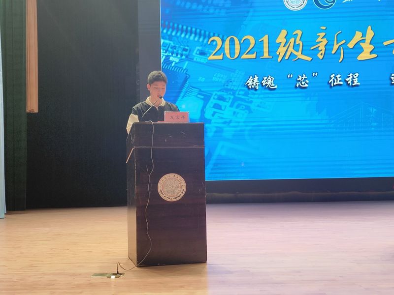 2021级本科新生刘睿齐分享了自己加入苏大、成为电院“芯青年”的激动心情,他表示,要主动学习独立和成长,做好目标规划,卸下懒惰,积极迎接挑战,坚定、勇敢地接过电影人的接力棒,践行“请党放心、强国有我”的青春誓言。
