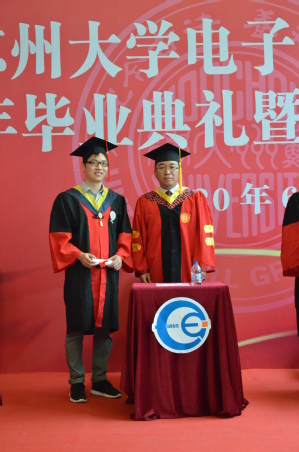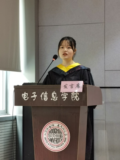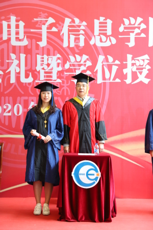 毕业典礼上,17级学术型硕士刘艺同学和本科生16级集成电路设计与集成系统专业汤雁婷同学分别代表毕业生发言,她们表达了对学校学院、对老师同学的眷恋与感激,道出了志存高远、直面挑战、脚踏实地、勇于奉献的决心与信心。全体2020届本科毕业生还向学院捐赠了“E起卓越”奖学金,用以鼓励学弟学妹不断进步、追求卓越。