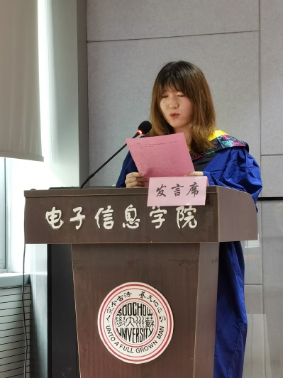 10:00,伴随着欢快的音乐,学位授予仪式在精心布置下的电子信息楼负一楼的喜庆氛围中隆重开始。