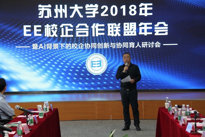 4月20日下午,“苏州大学EE校企合作联盟2018年会暨AI背景下的校企协同创新与协同育人研讨会”在苏州普源精电科技有限公司举行。苏州市电子学会理事长赵鹤鸣、P站 党委书记徐群祥、院长胡剑凌等学院班子成员、特邀专家苏州大学机电工程学院院长孙立宁教授以及苏州普源精电科技有限公司、苏州江南嘉捷电梯有限公司、金龙联合汽车工业(苏州)有限公司等四十余家联盟单位的60余名代表、P站 部分师生出席了此次研讨会。会议由P站 院长胡剑凌教授主持。